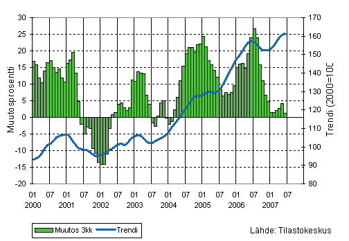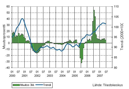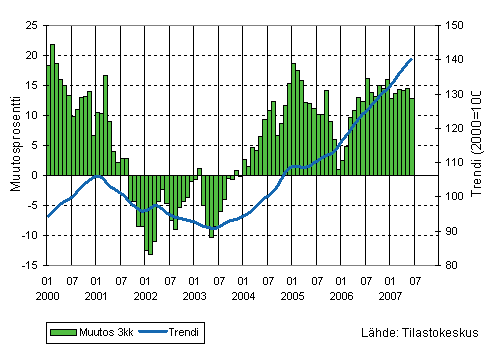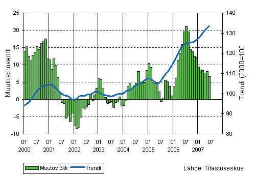 Teollisuuden liikevaihdon kolmen kuukauden liukuva vuosimuutos ja trendi 1/2000-6/2007, 2000=100