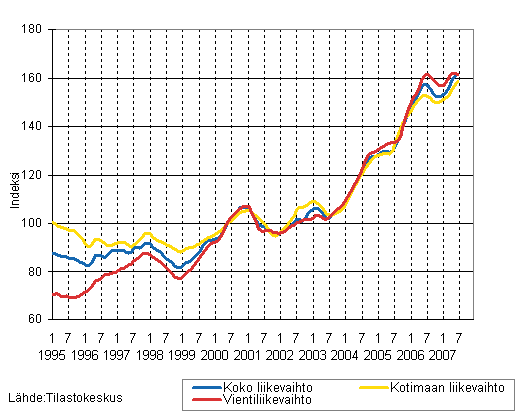 Kemianteollisuuden liikevaihdon, kotimaan liikevaihdon ja vientiliikevaihdon trendisarjat 1/1995 - 06/2007, 2000=100