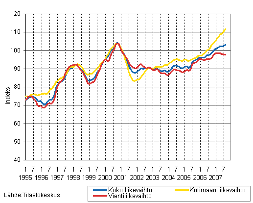 Puu- ja paperiteollisuuden liikevaihdon, kotimaan liikevaihdon ja vientiliikevaihdon trendisarjat 1/1995 - 08/2007, 2000=100