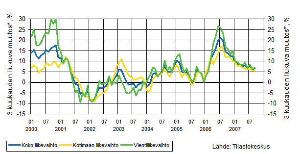 Koko liikevaihdon, vientiliikevaihdon ja kotimaan myynnin kehitys 1/2000 - 9/2007, kolmen kuukauden liukuva vuosimuutos, %