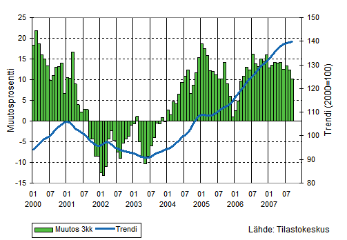 Teollisuuden liikevaihdon kolmen kuukauden liukuva vuosimuutos ja trendi 1/2000-9/2007, 2000=100