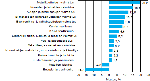 Liikevaihto kasvoi heinä-syyskuussa erityisesti metalliteollisuuden alatoimialoilla. Eniten liikevaihto kasvoi metallituotteiden valmistuksessa, 20,2 prosenttia ja koneiden ja laitteiden valmistuksessa, 15,6 prosenttia. Suurista toimialoista liikevaihto kasvoi sähkö- ja elektroniikkateollisuudessa 9,8 prosenttia, kemianteollisuudessa 8,7 prosenttia ja puu- ja paperiteollisuudessa 3,3 prosenttia vuodentakaisesta. Liikevaihto kasvoi heinä-syyskuussa muilla teollisuuden alatoimialoilla paitsi metallien jalostuksessa ja energia- ja vesihuollossa.
