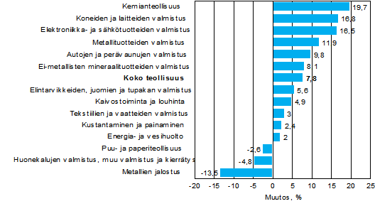 Liikevaihto kasvoi loka-joulukuussa eniten kemianteollisuudessa, 19,7 prosenttia ja koneiden ja laitteiden valmistuksessa, 16,8 prosenttia. Liikevaihdon kasvu oli ripeää kaikilla metalliteollisuuden alatoimialoilla metallien jalostusta lukuun ottamatta. Metallien jalostuksessa liikevaihto väheni 13,5 prosenttia vuotta aiemmasta. Muista suurista toimialoista liikevaihto kasvoi energia- ja vesihuollossa 2,0 prosenttia ja väheni puu- ja paperiteollisuudessa 2,6 prosenttia vuodentakaisesta.