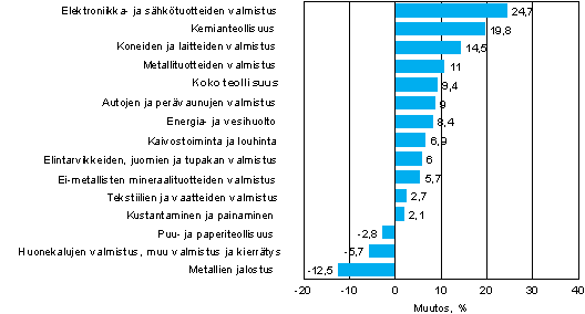 Liikevaihto kasvoi marras-tammikuussa eniten elektroniikka- ja sähkötuotteiden valmistuksessa, 24,7 prosenttia ja kemianteollisuudessa, 19,8 prosenttia. Liikevaihdon kasvu oli ripeää kaikilla metalliteollisuuden alatoimialoilla metallien jalostusta lukuun ottamatta. Metallien jalostuksessa liikevaihto väheni 12,5 prosenttia vuotta aiemmasta. Muista suurista toimialoista liikevaihto kasvoi energia- ja vesihuollossa 8,4 prosenttia ja väheni puu- ja paperiteollisuudessa 2,8 prosenttia vuodentakaisesta.