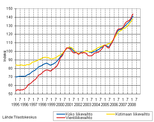 Koko teollisuuden liikevaihdon, kotimaan liikevaihdon ja vientiliikevaihdon trendisarjat 1/1995 - 2/2008, 2000=100