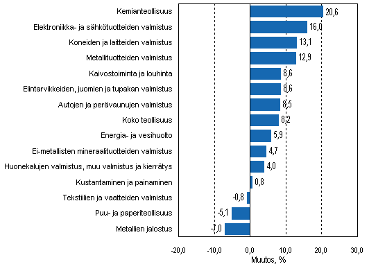 Tammi-maaliskuussa koko teollisuuden liikevaihto kasvoi runsaat 8 prosenttia vuodentakaisesta eli hieman enemmän kuin kolmella edellisellä vuosineljänneksellä. Koko teollisuuden kasvun nopeutumista tuki ensisijaisesti energia- ja vesihuollon liikevaihdon kääntyminen ripeähköön kasvuun. Muilla suurilla päätoimialoilla kasvu ei nopeutunut tammi-maaliskuussa edelliseen neljännekseen verrattuna mutta pysyi vahvana etenkin kemianteollisuudessa ja elektroniikka- ja sähkötuotteiden valmistuksessa. Myös koneiden ja laitteiden valmistuksessa liikevaihto kasvoi yhä kaksinumeroisin luvuin. Sen sijaan puu- ja paperiteollisuudessa liikevaihto väheni edellistä vuosineljännestä enemmän.