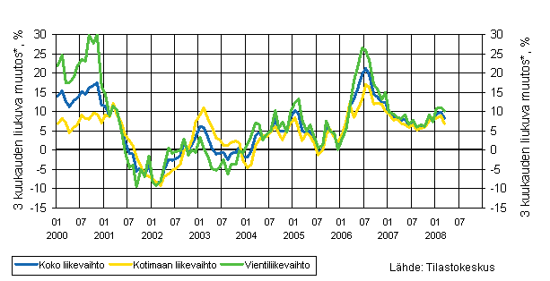 Koko liikevaihdon, vientiliikevaihdon ja kotimaan myynnin kehitys 1/2000 - 3/2008, kolmen kuukauden liukuva vuosimuutos, %