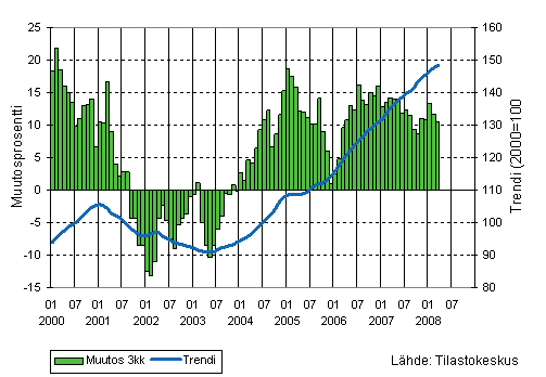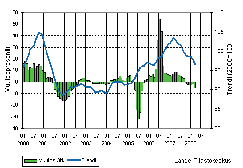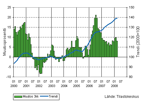 Teollisuuden liikevaihdon kolmen kuukauden liukuva vuosimuutos ja trendi 1/2000-3/2008, 2000=100