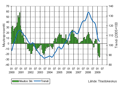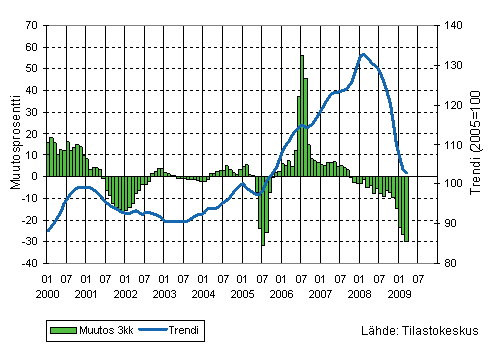 Metsäteollisuuden liikevaihdon kolmen kuukauden liukuva vuosimuutos ja trendi 1/2000-03/2009, 2005=100
