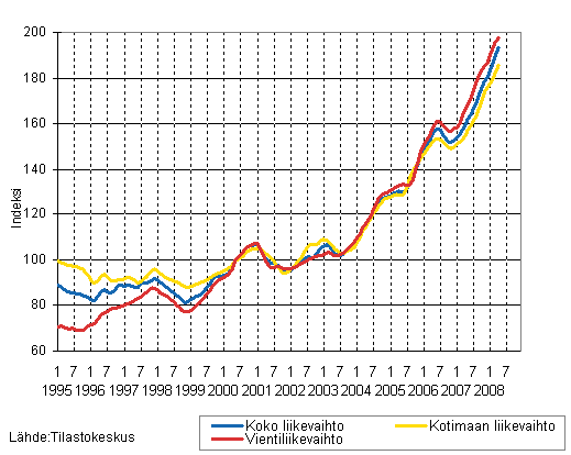 Kemianteollisuuden liikevaihdon, kotimaan liikevaihdon ja vientiliikevaihdon trendisarjat 1/1995 - 4/2008, 2000=100