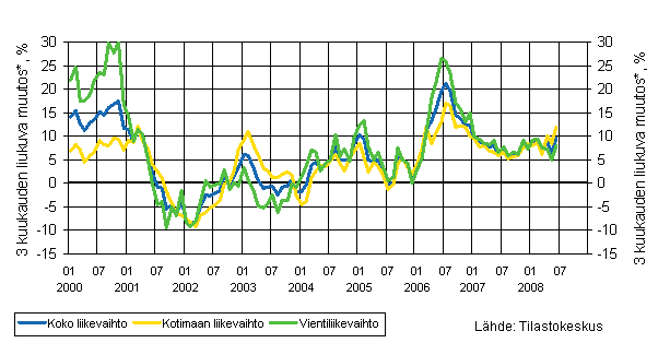 Koko liikevaihdon, vientiliikevaihdon ja kotimaan myynnin kehitys 1/2000 - 6/2008, kolmen kuukauden liukuva vuosimuutos, %
