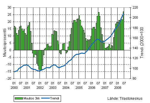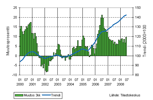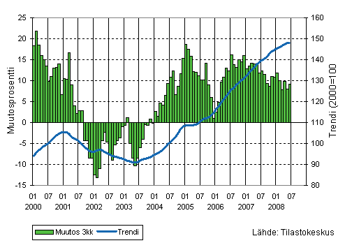 Teollisuuden liikevaihdon kolmen kuukauden liukuva vuosimuutos ja trendi 1/2000-6/2008, 2000=100