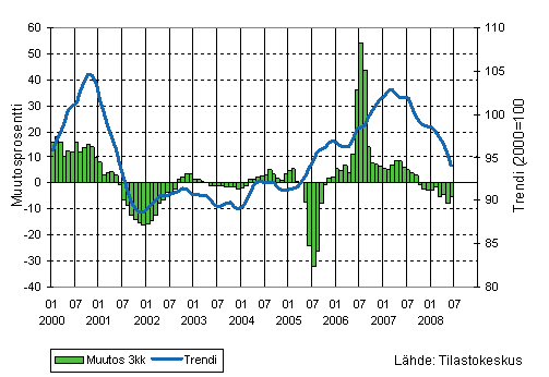 Metalliteollisuuden liikevaihdon kolmen kuukauden liukuva vuosimuutos ja trendi 1/2000-6/2008, 2000=100