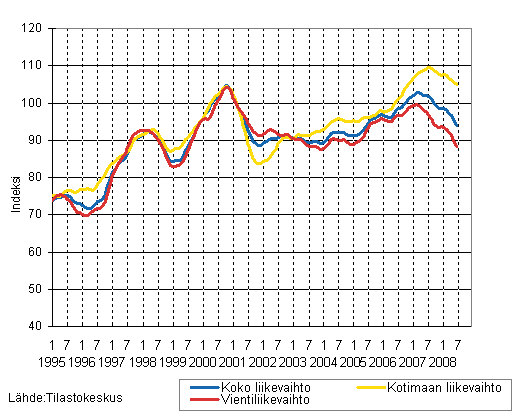 Puu- ja paperiteollisuuden liikevaihdon, kotimaan liikevaihdon ja vientiliikevaihdon trendisarjat 1/1995 - 6/2008, 2000=100