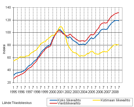 Sähkö- ja elektroniikkateollisuuden liikevaihdon, kotimaan liikevaihdon ja vientiliikevaihdon trendisarjat 1/1995 - 6/2008, 2000=100