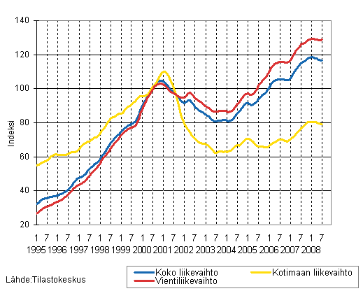 Sähkö- ja elektroniikkateollisuuden liikevaihdon, kotimaan liikevaihdon ja vientiliikevaihdon trendisarjat 1/1995 - 7/2008, 2000=100