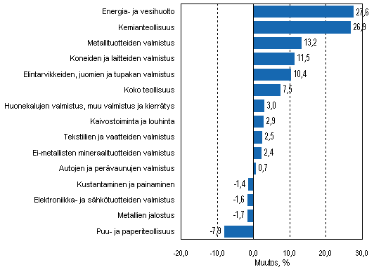 Liikevaihto kasvoi touko-heinäkuussa eniten energia- ja vesihuollossa, 27,6 prosenttia ja kemianteollisuudessa, 26,9 prosenttia. Liikevaihdon kasvu oli ripeää myös metallituotteiden, koneiden ja laitteiden sekä elintarvikkeiden, juomien ja tupakan valmistuksessa. Sen sijaan elektroniikka- ja sähkötuotteiden valmistuksessa liikevaihdon muutos kääntyi 1,6 prosentin laskuun. Metallien jalostuksessa liikevaihto väheni 1,7 prosenttia sekä puu- ja paperiteollisuudessa 7,9 prosenttia vuodentakaisesta.