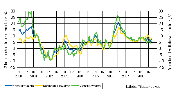 Koko liikevaihdon, vientiliikevaihdon ja kotimaan myynnin kehitys 1/2000 - 9/2008, kolmen kuukauden liukuva vuosimuutos, %