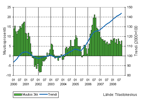 Teollisuuden liikevaihdon kolmen kuukauden liukuva vuosimuutos ja trendi 1/2000-9/2008, 2000=100