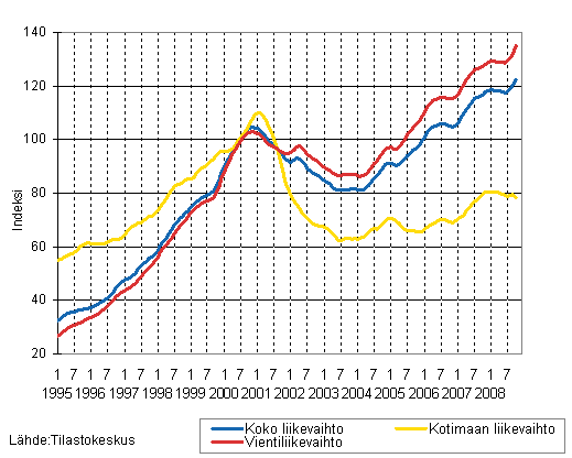 Sähkö- ja elektroniikkateollisuuden liikevaihdon, kotimaan liikevaihdon ja vientiliikevaihdon trendisarjat 1/1995 - 10/2008, 2000=100