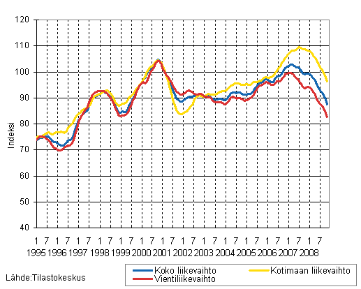 Puu- ja paperiteollisuuden liikevaihdon, kotimaan liikevaihdon ja vientiliikevaihdon trendisarjat 1/1995 - 11/2008, 2000=100
