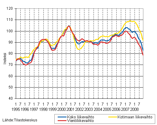Puu- ja paperiteollisuuden liikevaihdon, kotimaan liikevaihdon ja vientiliikevaihdon trendisarjat 1/1995 - 12/2008, 2000=100