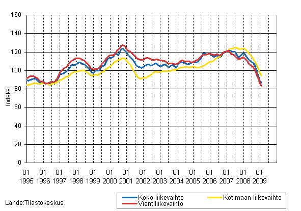 Metsäteollisuuden liikevaihdon, kotimaan liikevaihdon ja vientiliikevaihdon trendisarjat 1/1995 - 02/2009, 2005=100, (TOL 2008)
