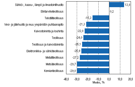 Liikevaihto kasvoi tammi-maaliskuussa sähkö-, kaasu-, lämpö- ja ilmastointihuollossa (13,8 %) sekä elintarviketeollisuudessa (0,2 %). Eniten liikevaihto supistui kemianteollisuudessa, jossa se oli 29,8 prosenttia edellisvuoden vastaavaa ajanjaksoa alhaisempi. Sähkö-, kaasu-, lämpö- ja ilmastointihuoltoa sekä elintarviketeollisuutta lukuun ottamatta kaikilla merkittävimmillä toimialoilla liikevaihto supistui kaksinumeroisin luvuin.