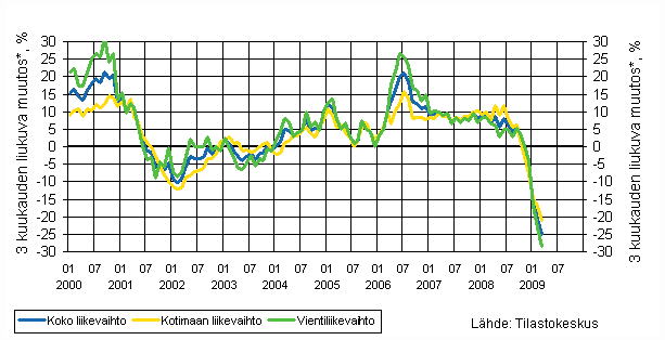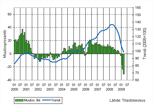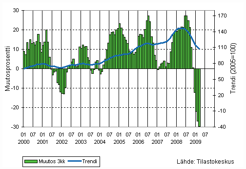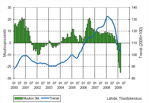 Korjaus. Katsausta korjattu 17.12.2009. Alkuperäisessä katsauksessa osa tiedoista koski virheellisesti vääriä toimialoja. Korjaukset on merkitty punaisella ja ne vaikuttavat myös kuvioihin Metsäteollisuuden liikevaihdon kolmen kuukauden liukuva vuosimuutos ja trendi 1/2000-03/2009, 2005=100 ja Metalliteollisuuden liikevaihdon kolmen kuukauden liukuva vuosimuutos ja trendi 1/2000-03/2009, 2005=100.