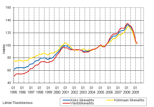 Teollisuuden liikevaihdon, kotimaan liikevaihdon ja vientiliikevaihdon trendisarjat 1/1995 - 3/2009, 2005=100, (TOL 2008)