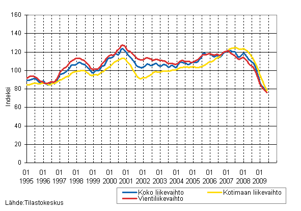 Metsäteollisuuden liikevaihdon, kotimaan liikevaihdon ja vientiliikevaihdon trendisarjat 1/1995 - 6/2009, 2005=100, (TOL 2008)