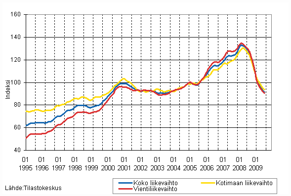 Teollisuuden liikevaihdon, kotimaan liikevaihdon ja vientiliikevaihdon trendisarjat 1/1995 - 7/2009, 2005=100, (TOL 2008)
