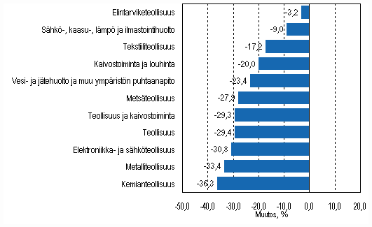 Liikevaihto supistui touko-heinäkuussa kaikilla toimialoilla. Pienin vähennys oli elintarviketeollisuudessa (-3,2 %) sekä sähkö-, kaasu-, lämpö- ja ilmastointihuollossa (-9,0 %). Muilla teollisuuden toimialoilla liikevaihto supistui huomattavasti enemmän. Nopeinta pudotus oli kemianteollisuudessa (-36,3 %) sekä metalliteollisuudessa (-33,4 %).