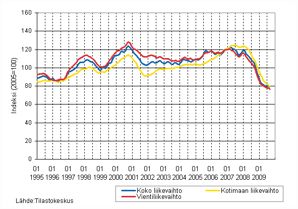 Metsäteollisuuden liikevaihdon, kotimaan liikevaihdon ja vientiliikevaihdon trendisarjat 1/1995 - 9/2009, 2005=100, (TOL 2008)
