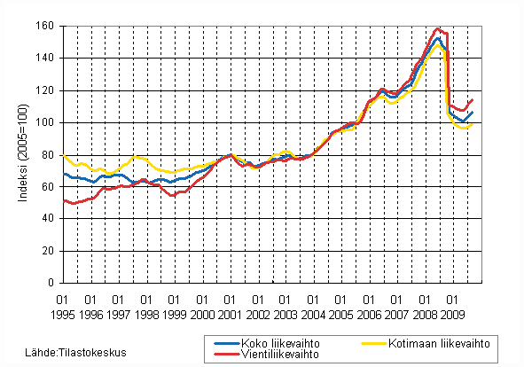 Kemianteollisuuden liikevaihdon, kotimaan liikevaihdon ja vientiliikevaihdon trendisarjat 1/1995 - 9/2009, 2005=100, (TOL 2008)