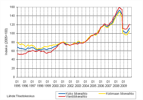 Kemianteollisuuden liikevaihdon, kotimaan liikevaihdon ja vientiliikevaihdon trendisarjat 1/1995 - 10/2009, 2005=100, (TOL 2008)
