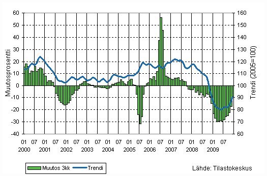 Metsäteollisuuden (TOL 16-17) liikevaihdon kolmen kuukauden liukuva vuosimuutos ja trendi 1/2000-12/2009, 2005=100