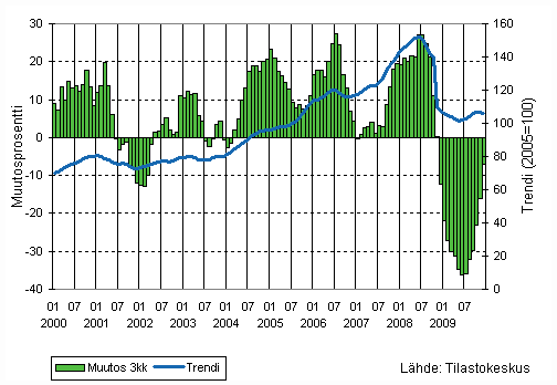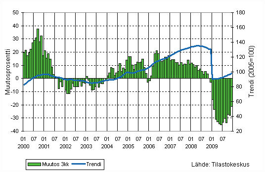 Vuonna 2009 teollisuuden liikevaihto laski huimaa vauhtia. Ensi merkit tulevasta koettiin jo vuoden 2008 viimeisellä neljänneksellä, jolloin lähes puoli vuosikymmentä jatkunut kasvu taittui. Raju pudotus on tiputtanut liikevaihdon vuoden 2004 alkupuoliskon tasolle. Kotimaan liikevaihdossa kehitys on ollut samansuuntainen kuin viennissä, mutta laskuvauhti ei ole ollut aivan yhtä voimakas.