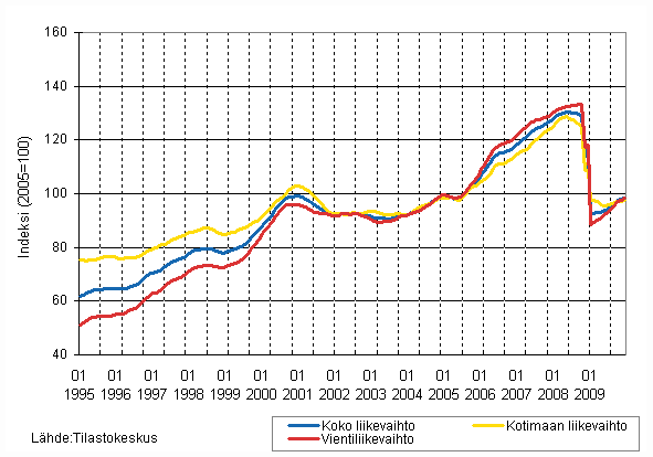 Teollisuuden liikevaihdon, kotimaan liikevaihdon ja vientiliikevaihdon trendisarjat 1/1995 - 12/2009, 2005=100, (TOL 2008)
