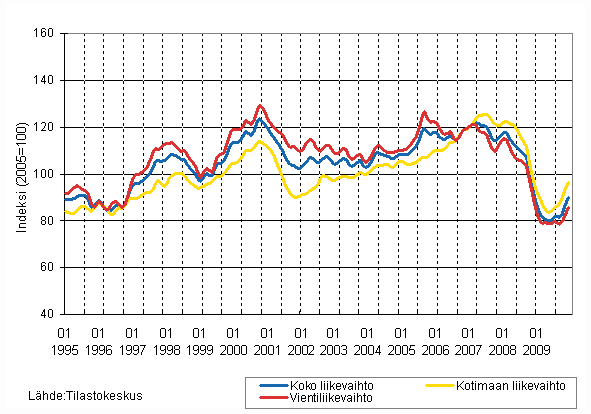 Metsäteollisuuden liikevaihdon, kotimaan liikevaihdon ja vientiliikevaihdon trendisarjat 1/1995 - 12/2009, 2005=100, (TOL 2008)