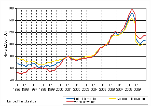 Kemianteollisuuden liikevaihdon, kotimaan liikevaihdon ja vientiliikevaihdon trendisarjat 1/1995 - 12/2009, 2005=100, (TOL 2008)