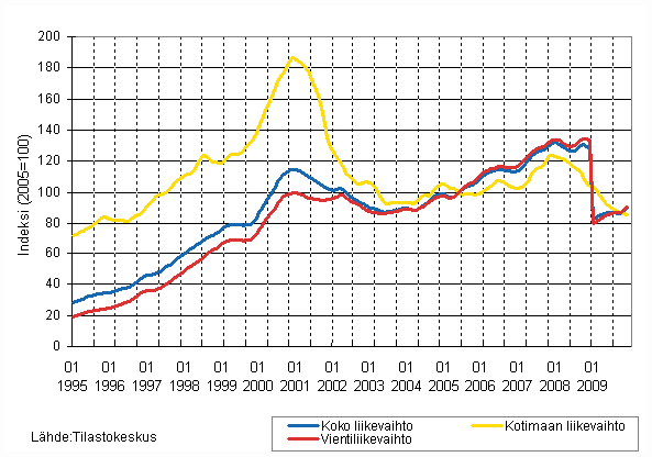 Sähkö- ja elektroniikkateollisuuden liikevaihdon, kotimaan liikevaihdon ja vientiliikevaihdon trendisarjat 1/1995 - 12/2009, 2005=100, (TOL 2008)