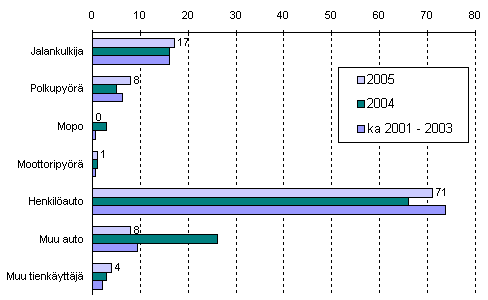 Tammi-huhtikuussa sattui henkilövahinkoon johtaneita tieliikenneonnettomuuksia 1 580, mikä on yhtä paljon kuin vuoden 2004 vastaavana aikana. Liikenteessä kuoli alkuvuonna 109 ihmistä eli 11 vähemmän kuin tammi-huhtikuussa 2004.