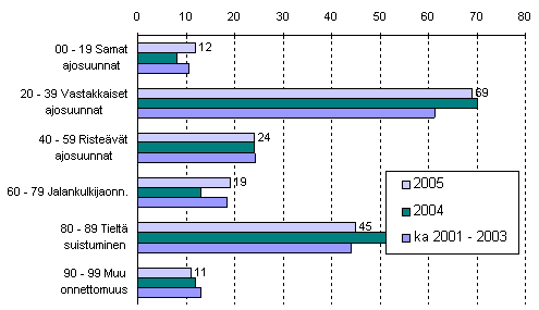 Liikennekuolemia sattui eniten onnettomuuksissa, joissa osalliset ajoivat vastakkaisiin ajosuuntiin. Näissä onnettomuuksissa kuoli 69 ihmistä. Toiseksi eniten kuolemia sattui tieltäsuistumisonnettomuuksissa, joissa kuoli 45, mikä on 14 vähemmän kuin vuonna 2004.