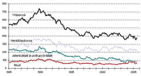 Alkuvuoden aikana henkilövahinkoon johtaneita tieliikenneonnettomuuksia tapahtui kaikkiaan 3 807. Onnettomuuksissa kuoli 220 ja loukkaantui 4 946 ihmistä. Kuolleita oli 5 enemmän ja loukkaantuneita 562 enemmän kuin vuoden 2004 vastaavana aikana. Surmansa saaneista oli liikkeellä henkilöautolla 146, pakettiautolla 6, kuorma-autolla 4 ja linja-autolla 1. Jalankulkijoita kuoli 20, polkupyöräilijöitä 20 ja moottoripyöräilijöitä 18. Lisäksi kuoli 5 muuta tienkäyttäjää.