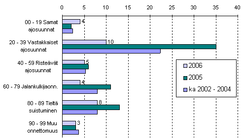 Liikennekuolemia sattui eniten onnettomuuksissa, joissa osalliset ajoivat vastakkaisiin ajosuuntiin. Näissä onnettomuuksissa kuoli 10 ihmistä eli 25 vähemmän kuin edellisvuonna. Toiseksi eniten kuolemia sattui tieltäsuistumisonnettomuuksissa, joissa kuoli 8, mikä on 5 vähemmän kuin vuonna 2005.