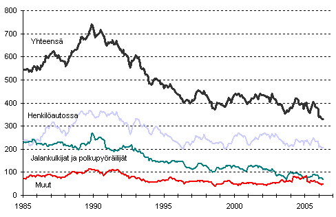 Alkuvuoden aikana henkilövahinkoon johtaneita tieliikenneonnettomuuksia tapahtui kaikkiaan 1 449. Onnettomuuksissa kuoli 67 ja loukkaantui 1 911 ihmistä. Kuolleita oli 42 vähemmän ja loukkaantuneita 173 vähemmän kuin vuoden 2005 vastaavana aikana. Surmansa saaneista oli liikkeellä henkilöautolla 48, kuorma-autolla 3, linja-autolla 2 ja pakettiautolla 1. Jalankulkijoita kuoli 9 ja polkupyöräilijöitä 2. Lisäksi kuoli 2 muuta tienkäyttäjää.