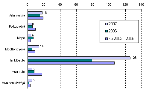 Tammi-kesäkuun tieliikenteessä kuoli 126 henkilöautolla liikkunutta ihmistä, kun vastaava luku vuotta aikaisemmin oli 79. Jalankulkijoita menehtyi 18.