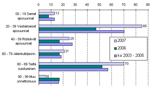 Liikennekuolemia sattui eniten onnettomuuksissa, joissa osapuolet ajoivat vastakkaisiin ajosuuntiin. Niissä kuoli 85 ihmistä eli 38 enemmän kuin edellisvuoden vastaavana aikana. Tieltäsuistumisonnettomuuksissa kuoli 70 ihmistä eli 18 enemmän kuin vuonna 2006.