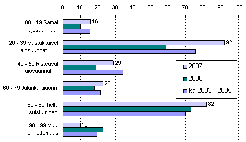Liikennekuolemia sattui eniten onnettomuuksissa, joissa osapuolet ajoivat vastakkaisiin ajosuuntiin. Niissä kuoli 92 ihmistä eli 33 enemmän kuin edellisvuoden vastaavana aikana. Tieltäsuistumisonnettomuuksissa kuoli 82 ihmistä eli 9 enemmän kuin vuonna 2006.